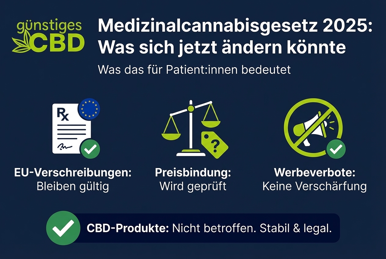 Die Debatte betrifft ausschließlich THC-haltiges Medizinalcannabis. CBD-Produkte mit THC unter 0,3 % fallen nicht unter das Betäubungsmittelrecht und sind davon nicht betroffen.
